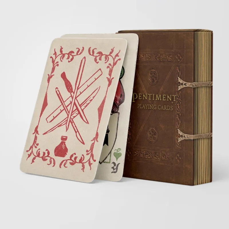 If you enjoyed playing Samuel’s Lansquenet in Pentiment, then you’ll enjoy playing it anywhere you go with this beautiful playing card deck! Each deck includes instructions for the 40-card game and has additional cards so the deck can be used to play more modern 52-card games.