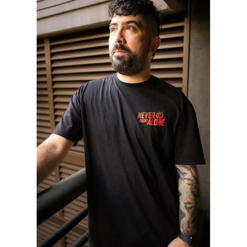 Show your support for suicide prevention and mental health advocacy with this special edition “Never Fight Alone” 2023 benefit t-shirt designed by artist Matt Ryan Tobin.