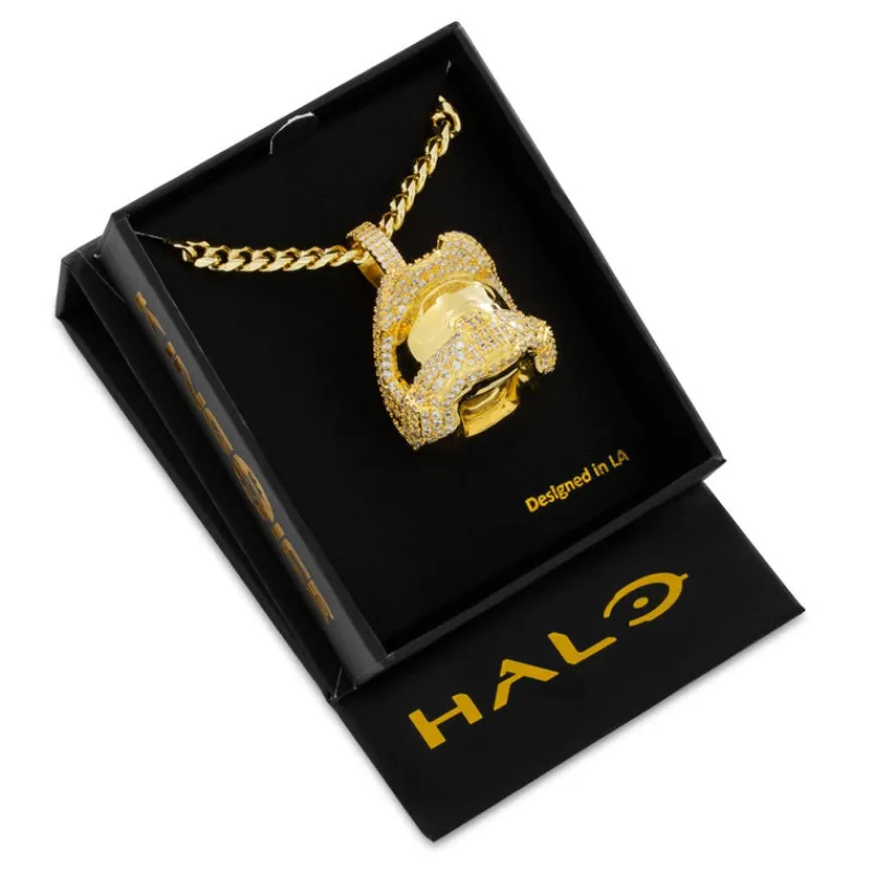 Master Chief’s helmet has been reimagined for streetwear. Featuring polished gold and hundreds of stones, this piece has full 360 degrees of detail including the visor, locking mechanism, and vents.