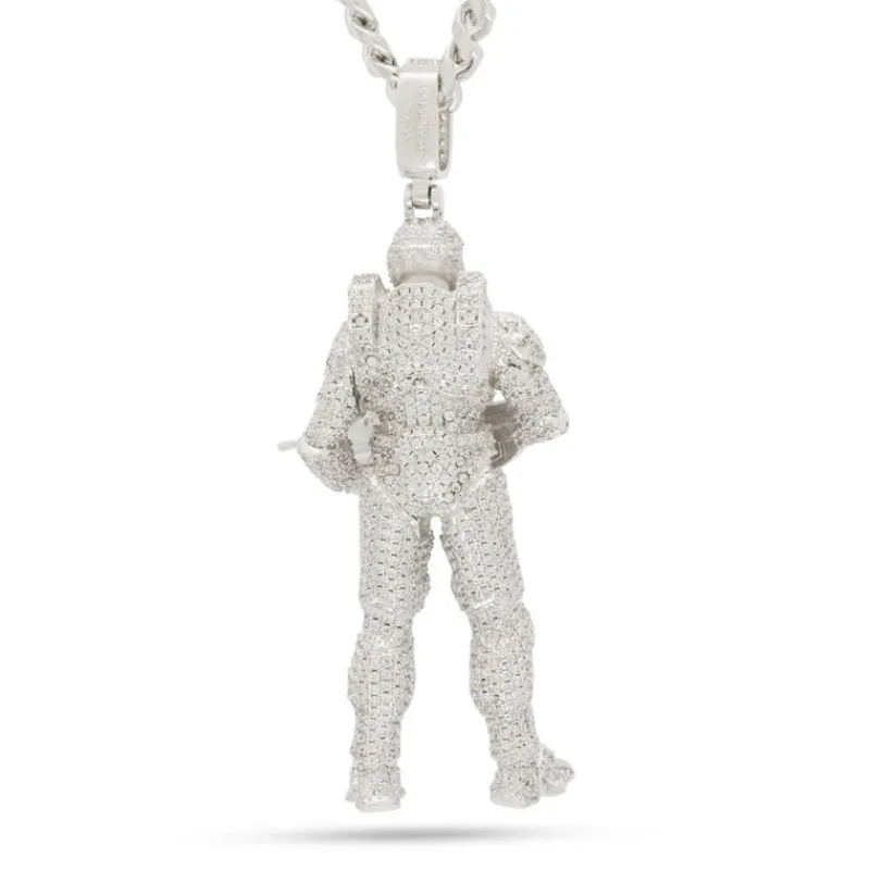 The protagonist of the Halo franchise is one of the iciest pieces we’ve made. Each piece of armor is individually modeled as actual armor would be and covered in over 1,400 stones for 360 degrees of detail.