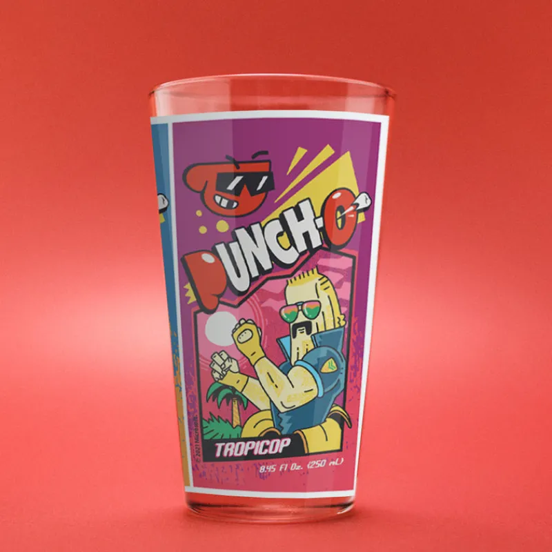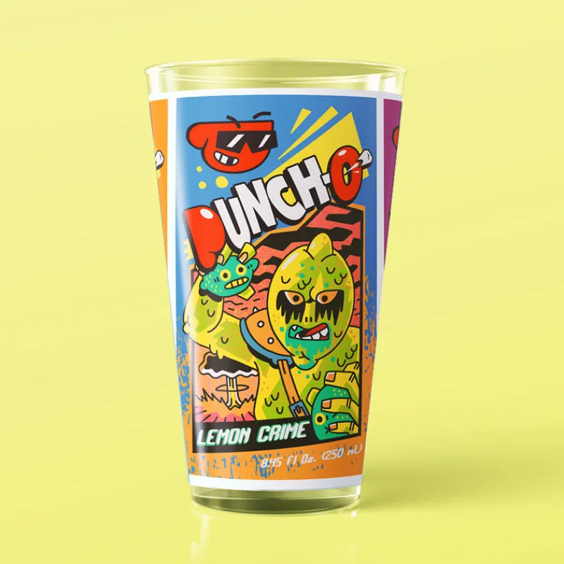 Enjoy some delicious PUNCH-O Lemon Crime or other beverage of your choice from this eye-catching Grounded PUNCH-O Pint Glass.