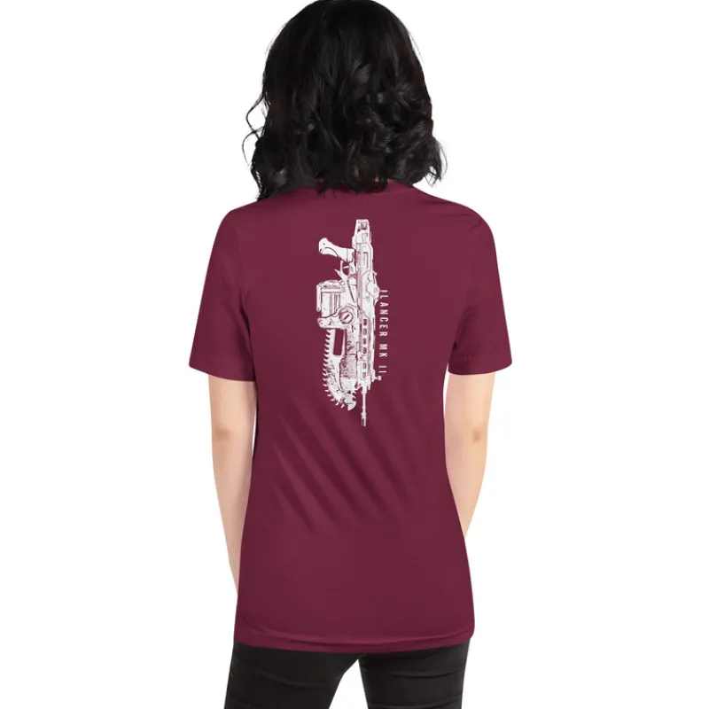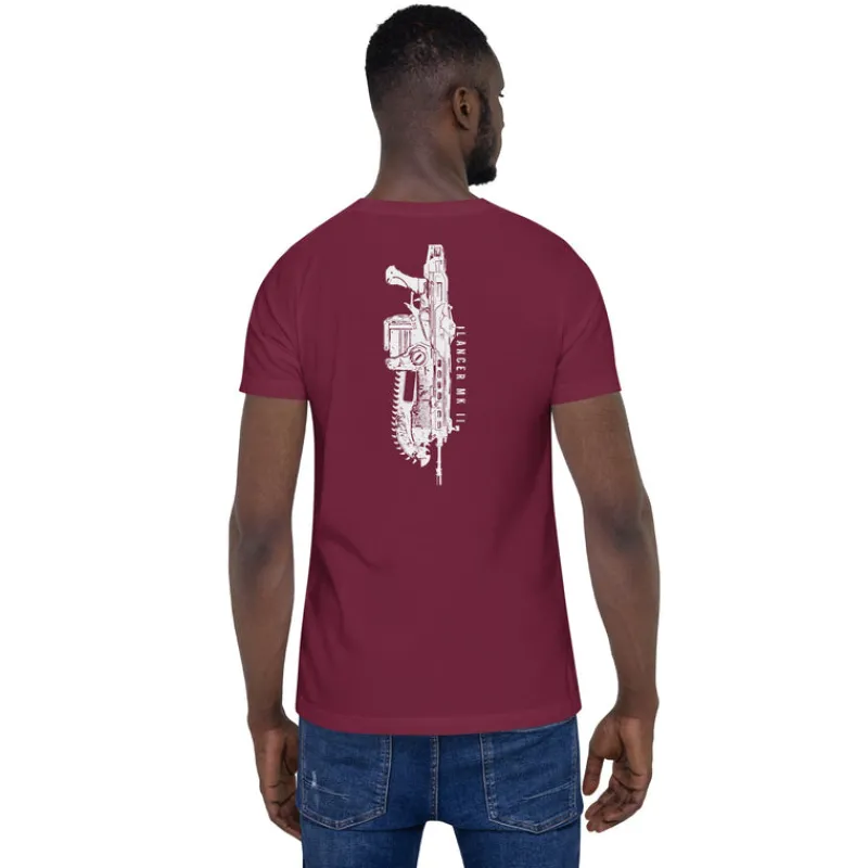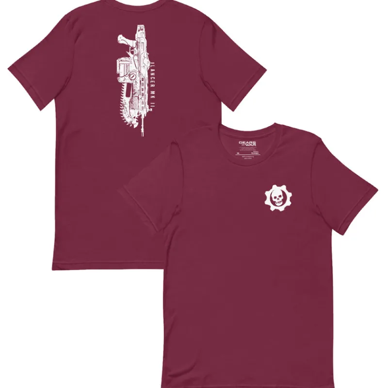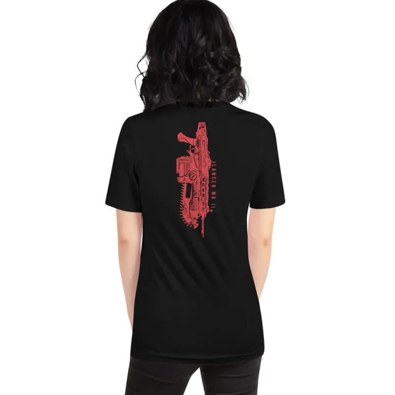 Show your love of Gears with this 100% cotton tee featuring the Crimson Omen on the front and iconic Lancer MK II on the back.