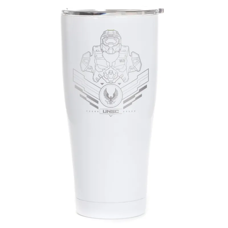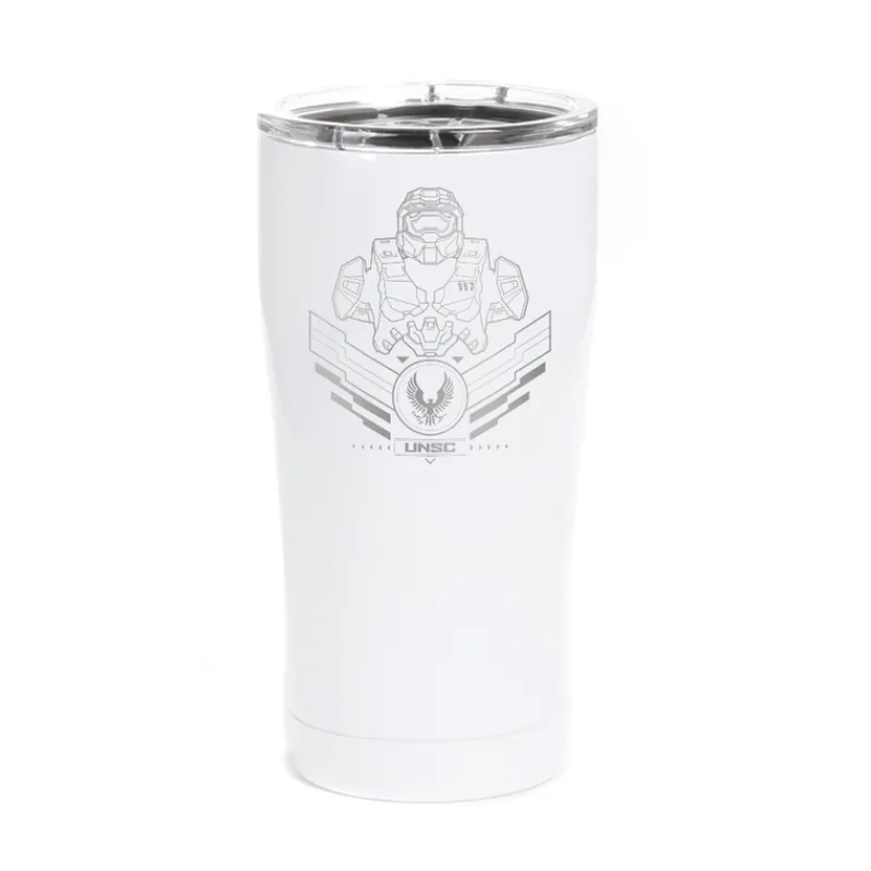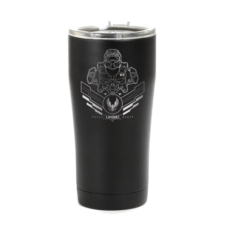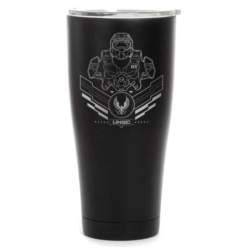 A crisp UNSC crest below looming line art of Master Chief will make every sip from this vacuum insulated, premium tumbler feel like an official reward for a job well done.